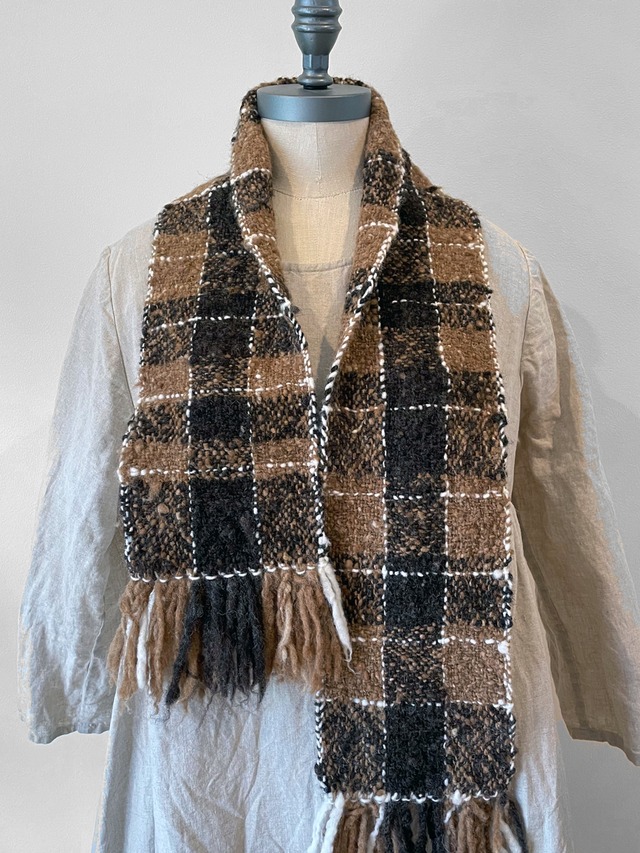 原毛の色味そのままで大柄なチェックを織りました。 揃っていそうで揃っていない、不揃いを楽しめるネックウェアです。 原毛:マンクス・コッツウォルド・他 サイズ(cm):L110xW14 (フリンジ8cm) 重さ(gram):126