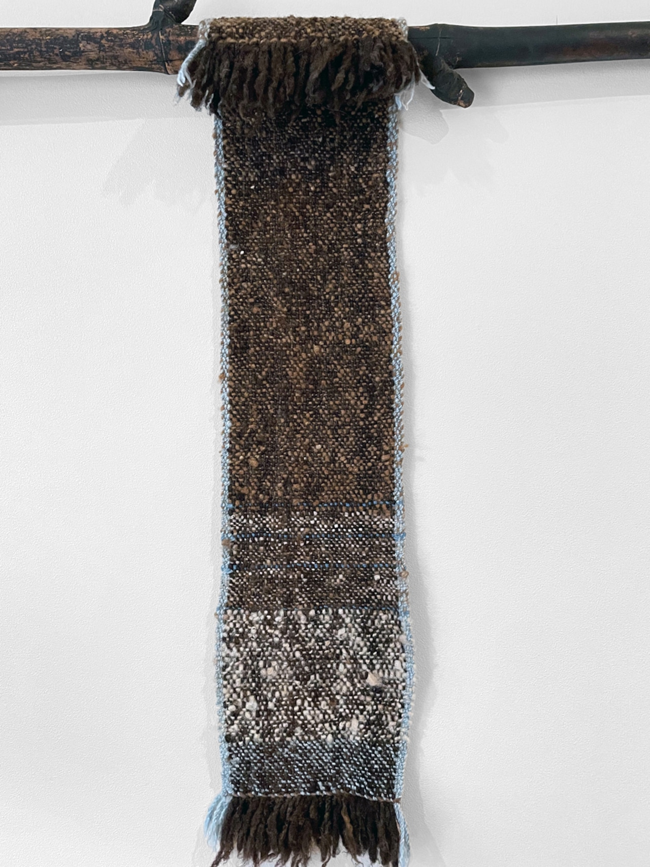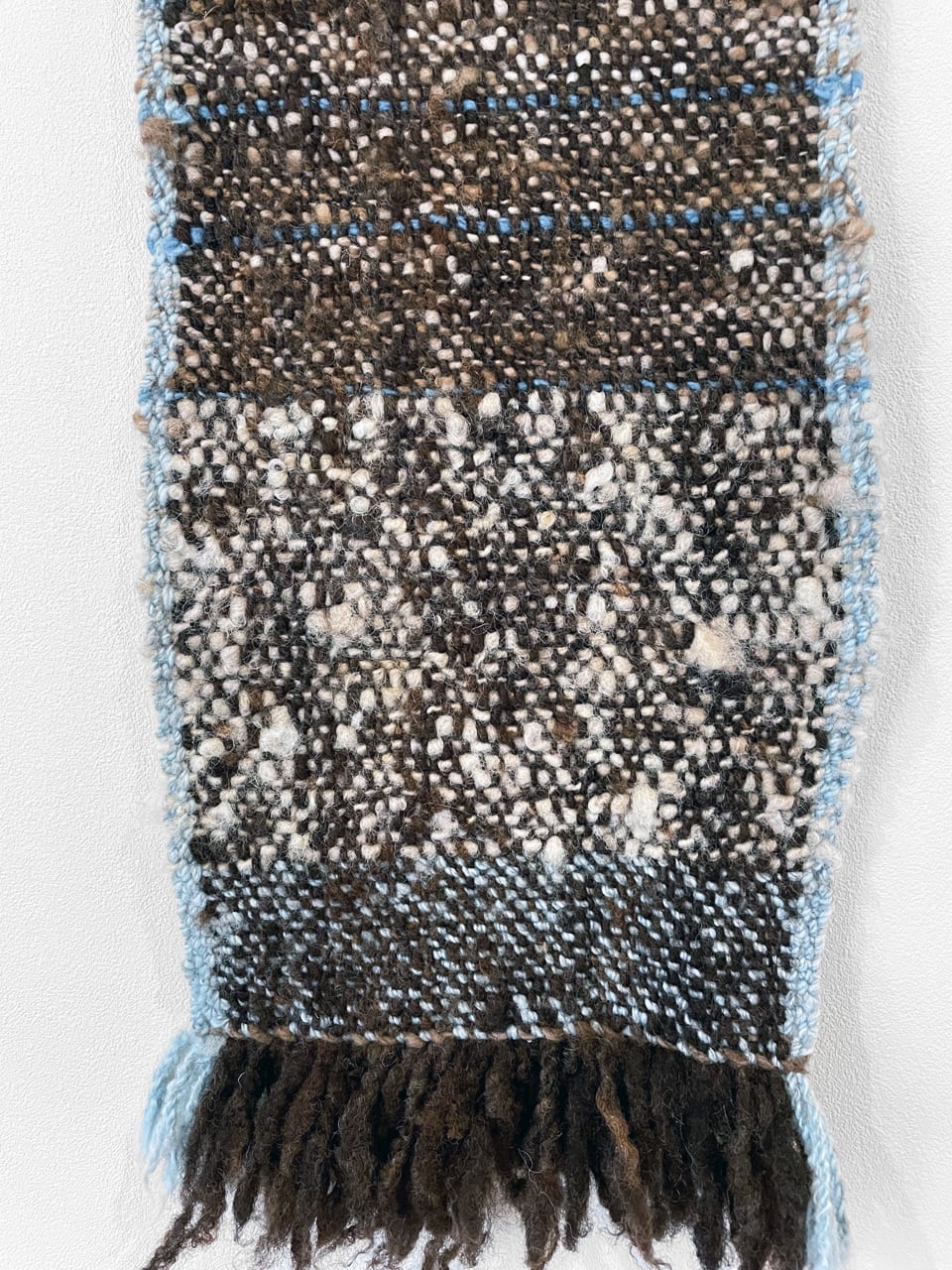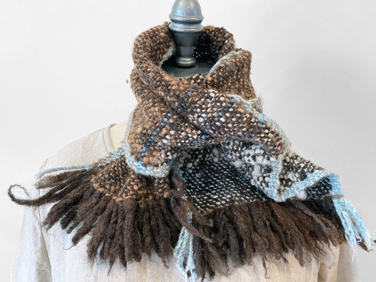 迫力感ある厚手手紡ぎ手織のツイード。両サイドの藍色で柔らかな印象に。