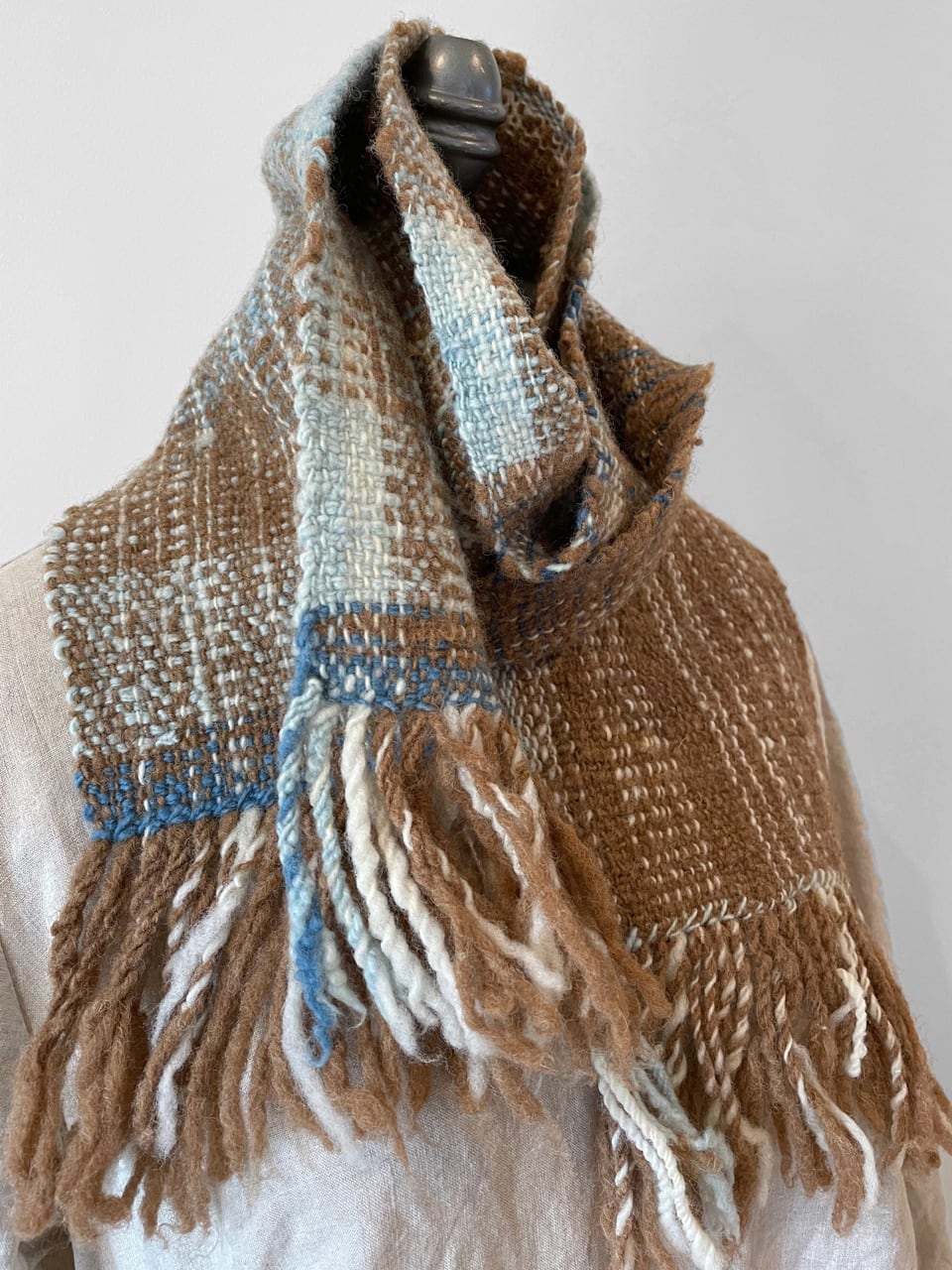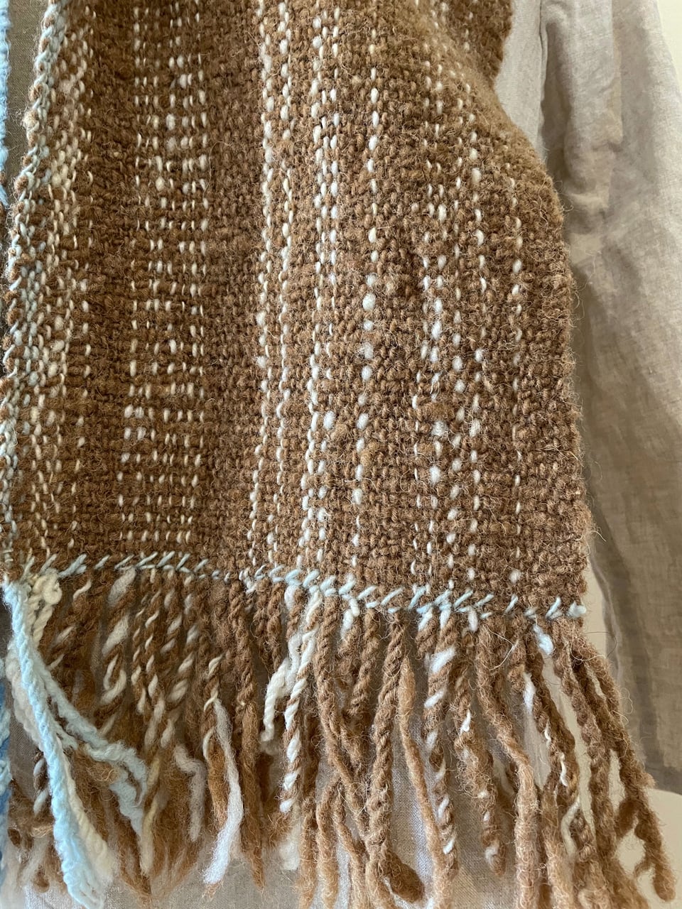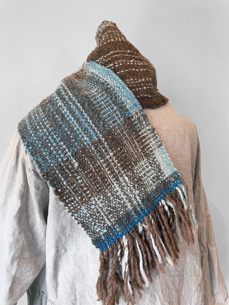 マンクスをベースに藍染の横糸を織り込んだマフラーです。