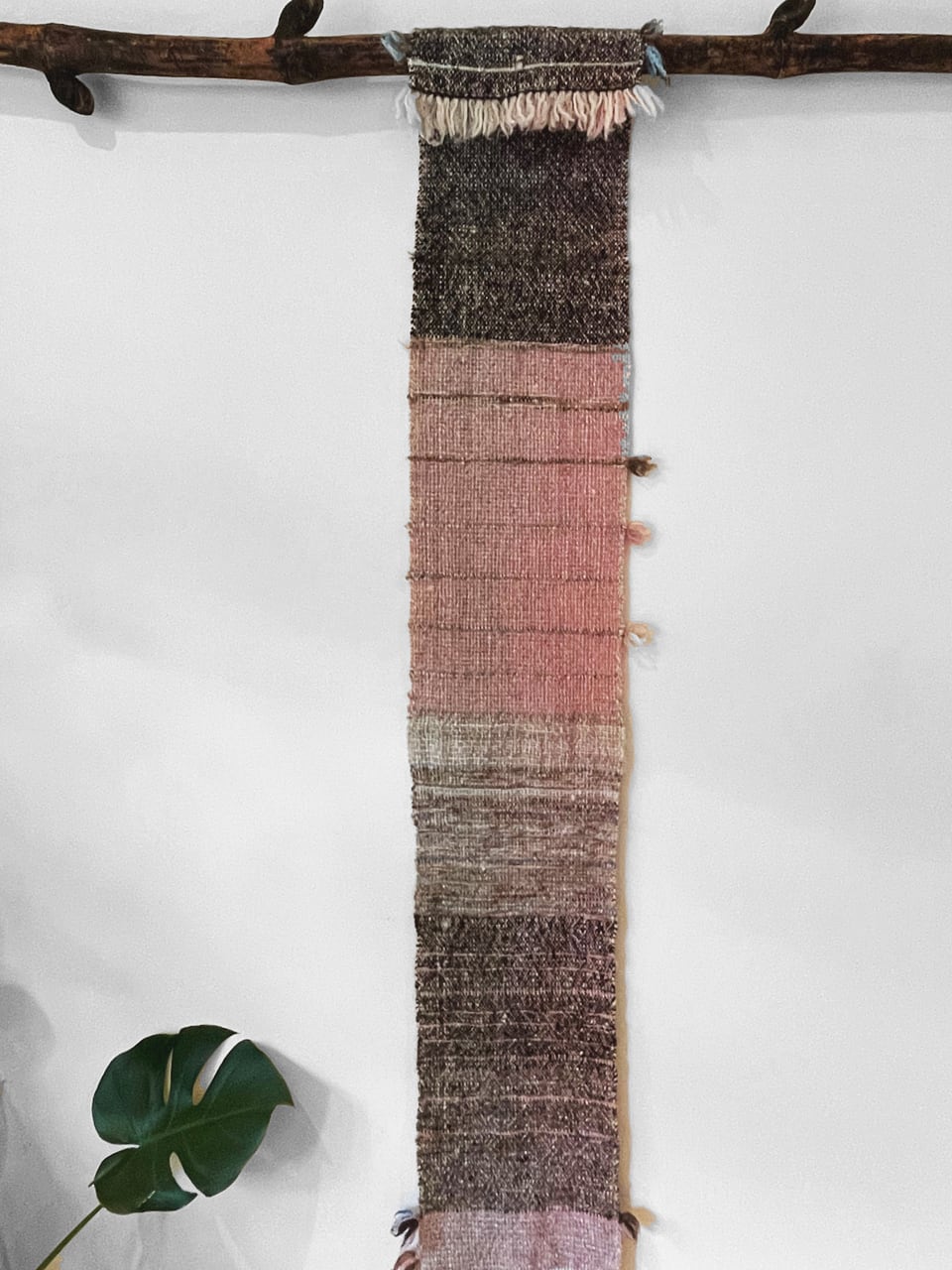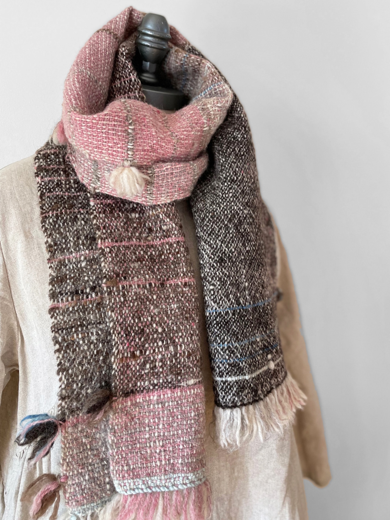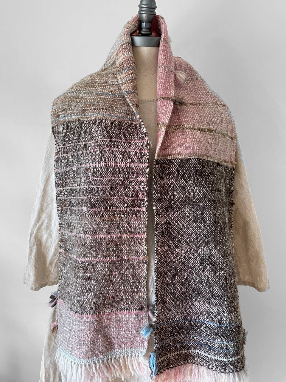 hachi textile works ではめずらしいスウェーデン製ピンクグレーのグラテーション糸を使ったショールです。